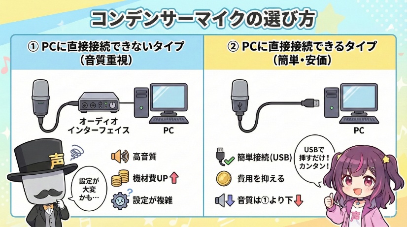 また、コンデンサーマイクでもPCに「①直接接続できない」タイプと「②直接接続できる」タイプがあります。