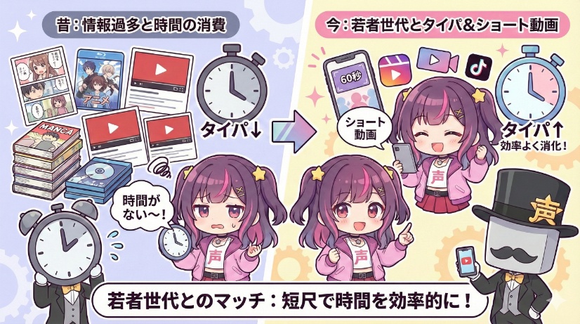 これは昔と比べて膨大な情報があふれており、それこそアニメや漫画、YouTube動画など娯楽コンテンツが消費しきれないほど増えているので、効率よく消化し時間帯効果を高めるタイパが重視されるようになっています。