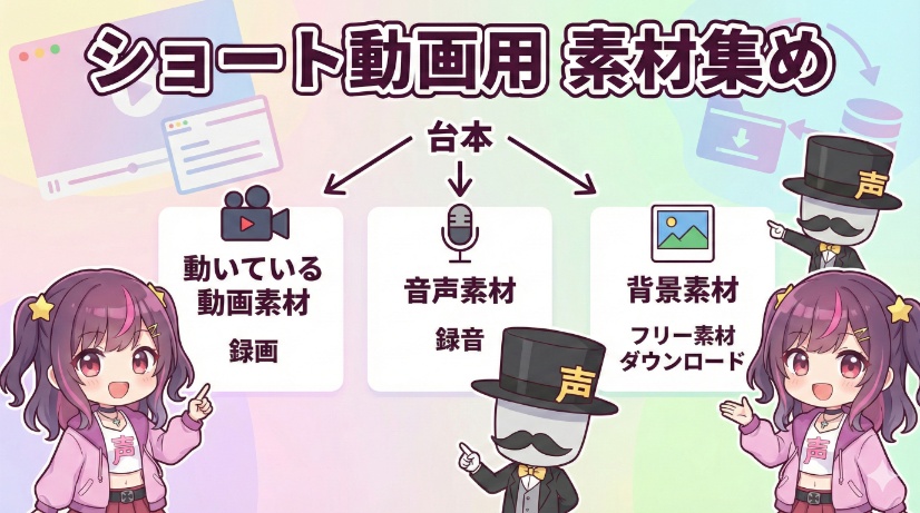 これらの素材を揃えるには録画や録音、フリー素材サイトからダウンロードなど、事前に作成した台本を元に集める必要があります。