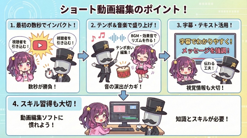 ショート動画の編集では、視聴者を引き込む工夫が求められ、短い時間で効果的にメッセージを伝える技術が必要です。