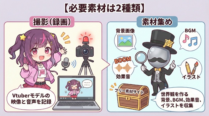 Vtuberモデルが動いている録画や、音声の録音であればOBSで可能ですし、背景やショート動画内に挿入したい小物素材については、フリー素材サイトで入手可能なので特に難しくはありません。