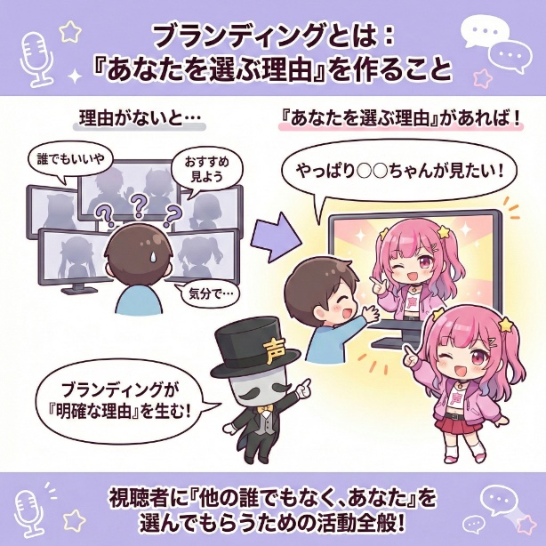 VTuberにおけるブランディングとは、無数の選択肢の中から、視聴者が「他の誰でもなく、あなたを見たい」と思うための、明確な「理由」を作り上げる活動全般を指します。