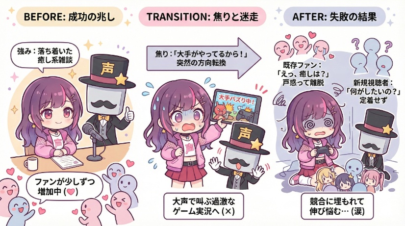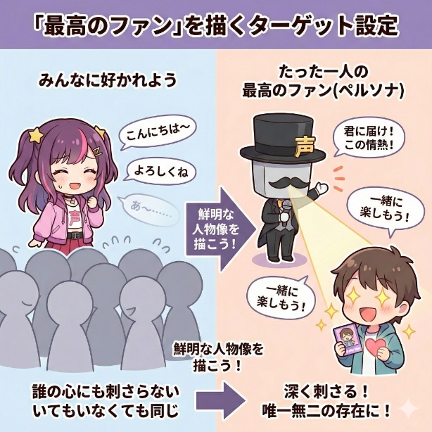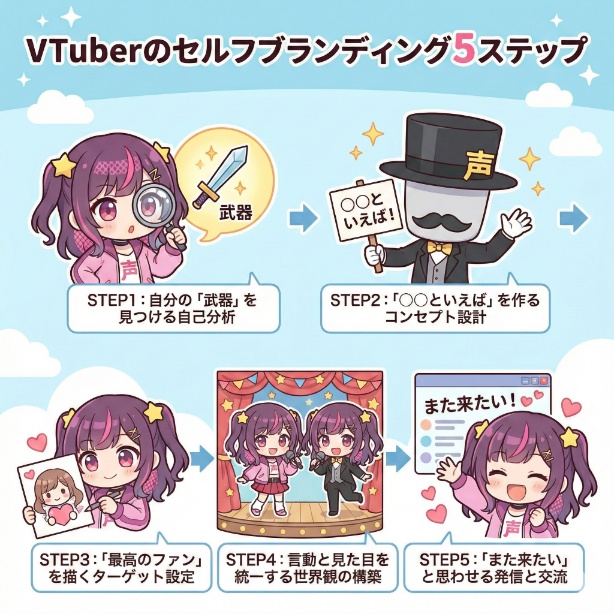 自己分析で核を見つけ、コンセプトを設計し、ターゲットを定め、世界観を構築し、ファンと交流する。この5つのステップを地道に繰り返すことで、あなたの存在は徐々に視聴者の心に刻まれ、「あなたでなければならない理由」が生まれます。