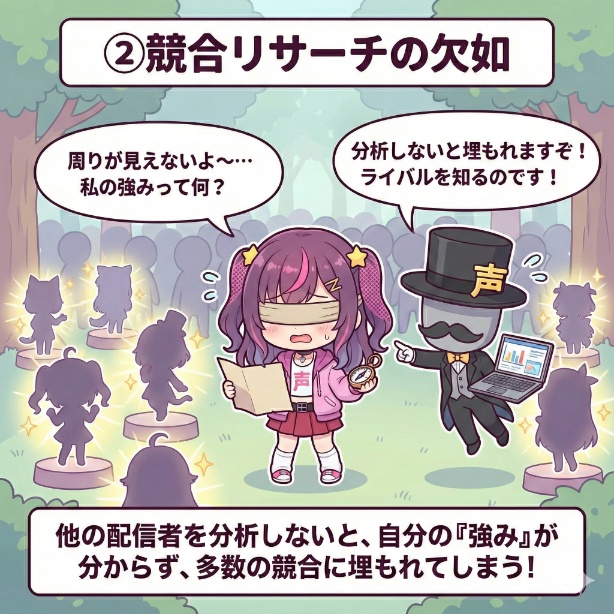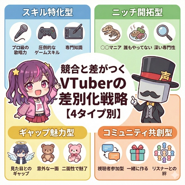 大手事務所のような潤沢なリソースがなくても、心配する必要はありません。競合と差がつく「VTuberの差別化戦略」を学び、あなただからこそできる戦い方を見つけましょう。