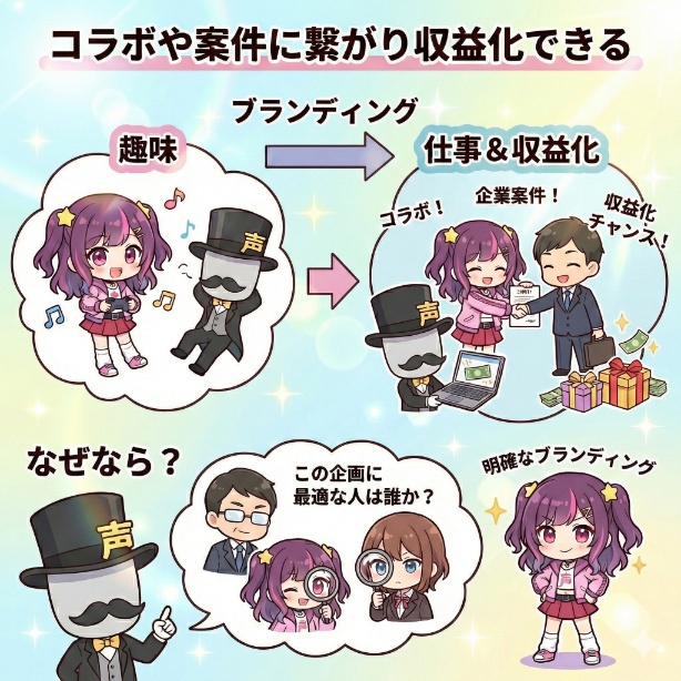 明確なVTuberブランディングは、あなたの活動を「趣味」から「仕事」へと引き上げ、コラボや企業案件といった収益化のチャンスを呼び込む強力な武器になります。
