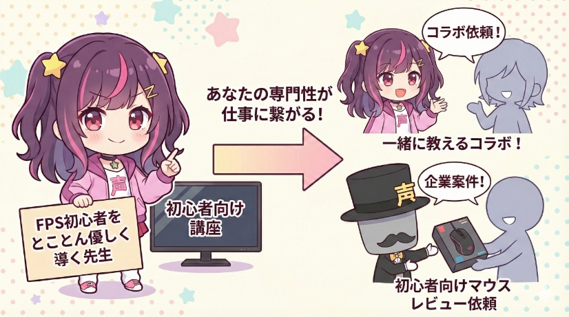 すると、同じように初心者を大切にする他のVTuberから「ぜひ一緒にプレイ方法を教えるコラボをしませんか?」と誘われたり、PCメーカーから「当社の初心者向けゲーミングマウスを、あなたの視点でレビューしてください」といった企業案件の依頼が舞い込んだりするかもしれません。