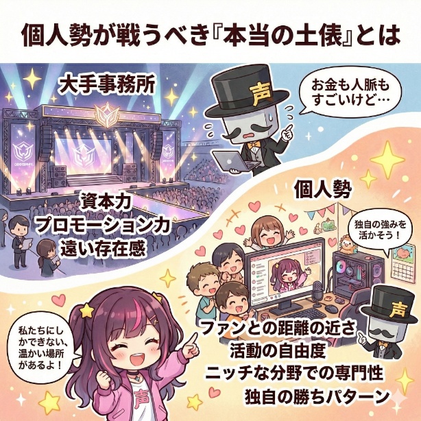 大手事務所に所属しているVtuberと同じ土俵で戦うのではなく、戦うべき土俵を見極め、あなたの個性が一番輝く場所を見つけましょう。