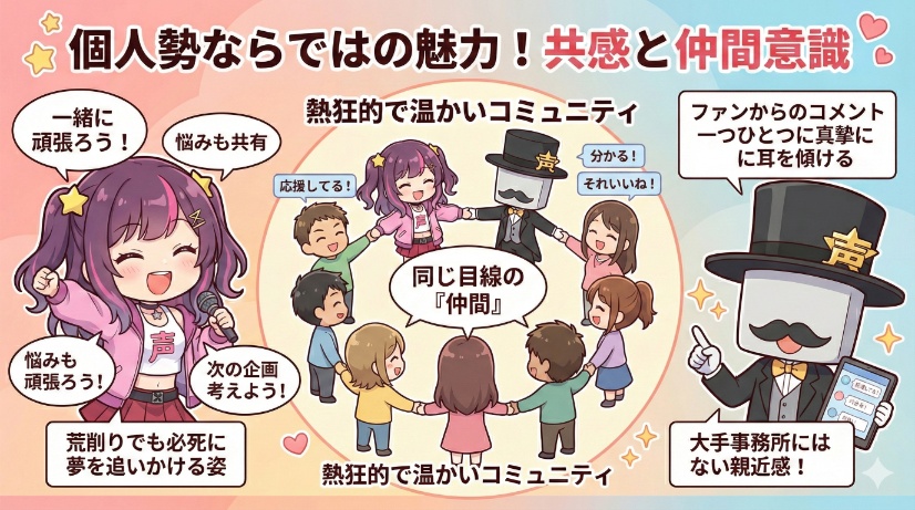 大手事務所の強みが「資本力」や「プロモーション力」であるのに対し、個人勢の武器は「ファンとの距離の近さ」「活動の自由度の高さ」、そして「ニッチな分野での専門性」です。