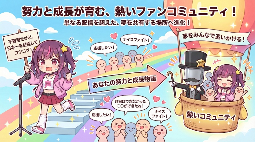 そこはもう単なる配信ではありません。あなたの夢をファン全員で追いかける、熱い「コミュニティ」へと進化していくのです。