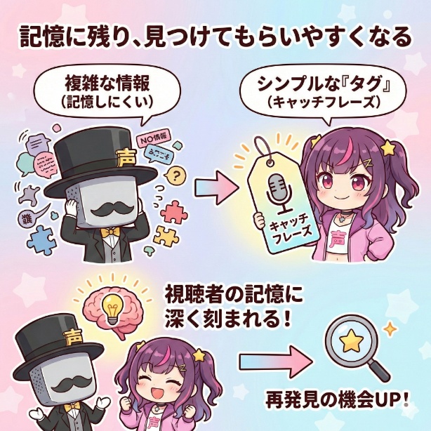 しっかりとしたブランディングは、あなたに「覚えやすいキャッチフレーズ」を与え、視聴者の記憶に深く刻み込まれることで、再発見される機会を劇的に増やしてくれます。