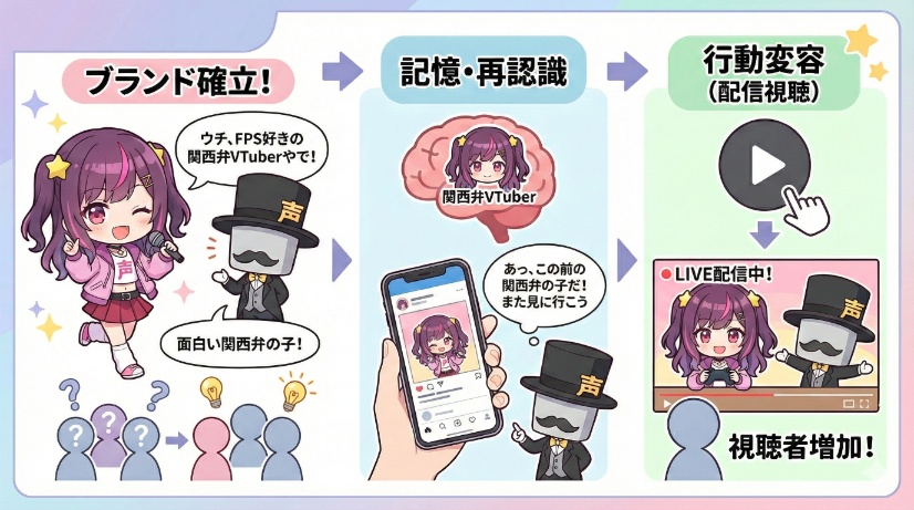 例えば、あなたが「FPSをプレイする関西弁VTuber」というブランドを確立したとします。すると、視聴者の行動に次のような変化が起きます。