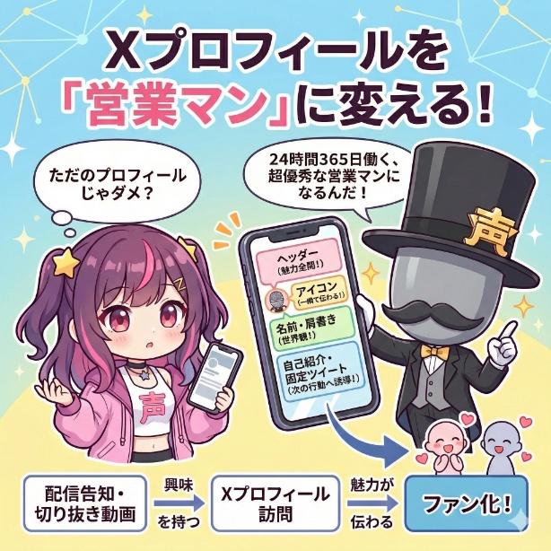 なぜなら、配信の告知や切り抜き動画であなたに興味を持った未来のファンが、次に向かう場所はあなたのXプロフィールの可能性が高いからです。