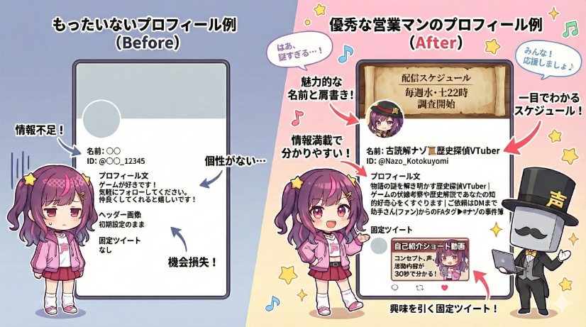 あなたのプロフィールは、本当にあなたの魅力を伝えきれていますか?ありがちな「もったいない例」と、ファンを惹きつける「改善例」を比べてみましょう。