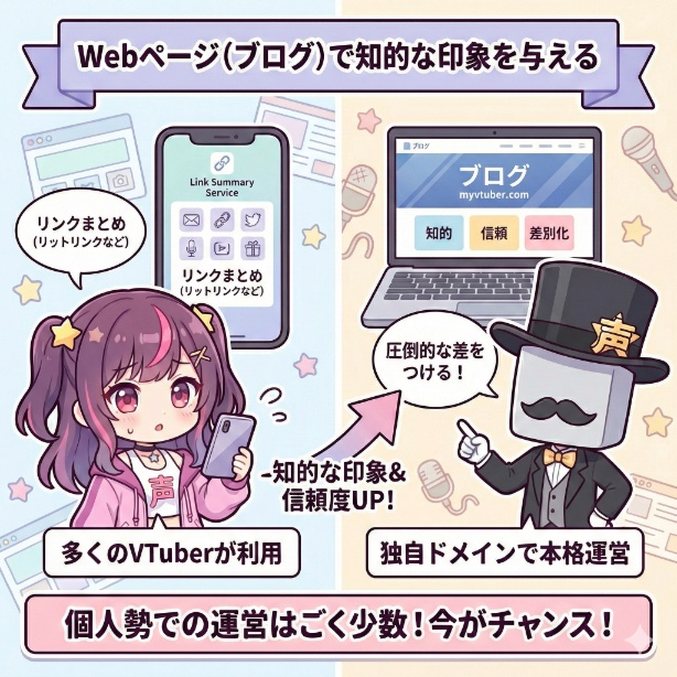 もしあなたが他のVTuberと圧倒的な差をつけたいと考えるなら、「自分だけの公式Webページ(ブログ)」を作成するという選択肢は、極めて強力な差別化戦略となります。