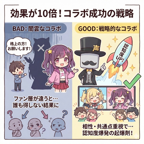 VTuber活動におけるコラボレーションは、あなたの認知度を一夜にして飛躍させる可能性を秘めた起爆剤ですが、その効果を最大化するためには、「誰と」「どうやるか」という極めて戦略的な視点が不可欠です。