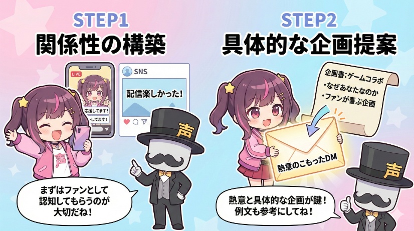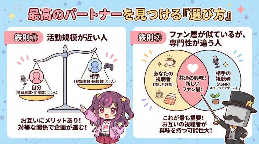 なぜなら、闇雲に格上の有名VTuberに声をかけても相手にされないことが多く、仮に実現したとしても、ファン層が違いすぎるとお互いの視聴者が楽しめず、誰も得をしない結果に終わってしまうからです。
