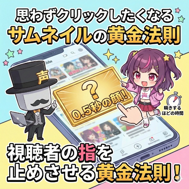 YouTubeのサムネイルは、あなたの動画がクリックされるか否かを決める、活動の中で最も重要な「0.5秒の顔」です。視聴者の指を止めさせるため、毎回必ず守るべき「黄金法則」を徹底しましょう。
