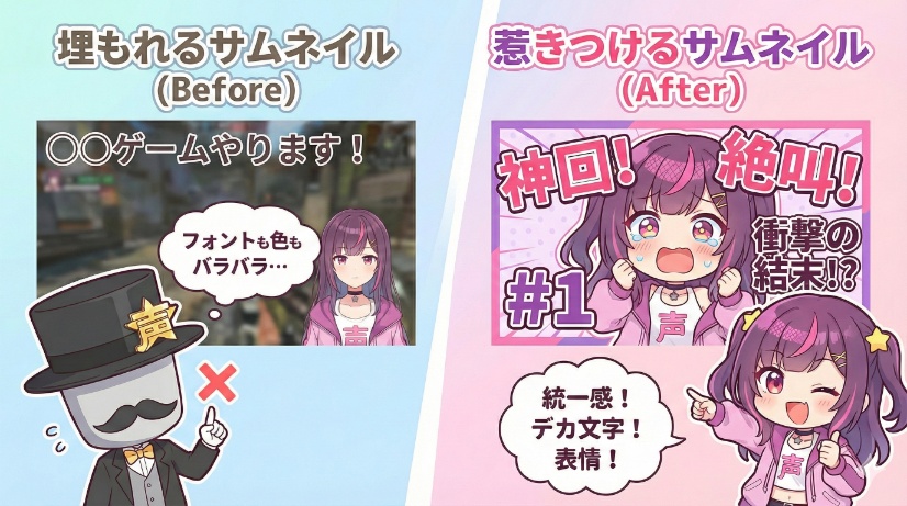あなたのサムネイルは、本当に視聴者の心を掴めているでしょうか?ありがちな「埋もれるサムネイル」と、クリックを誘う「惹きつけるサムネイル」の違いを見てみましょう。