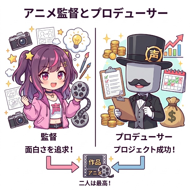 アニメ監督とプロデューサーの最も大きな違いは「この原作をアニメにしたい!」と企画するのがプロデューサーで、そのアニメを「こんな風に作りたい!」と制作するのが監督という点です。