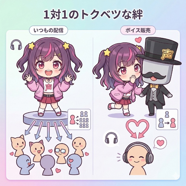 ボイス販売がもたらす最大のメリット、それは配信だけでは届けられない、ファン一人ひとりと「一対一」の特別な繋がりを育めることです。