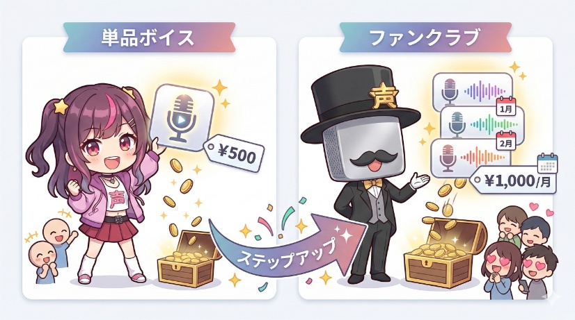 単品販売で気軽に楽しんでもらい、ファンクラブでより特別なボイスを提供して関係を築く、といったステップアップも可能になるのです。