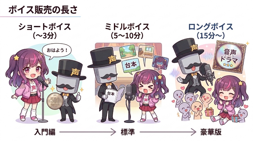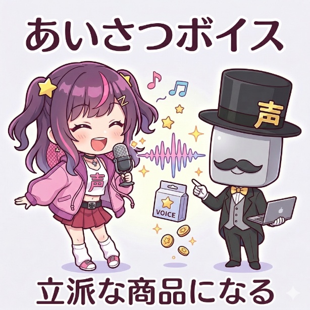 このように、あいさつボイスは制作者と購入者の双方にとって負担が少なく、ボイス販売の一連の流れ(企画→収録→編集→販売)を経験するのに最適です。