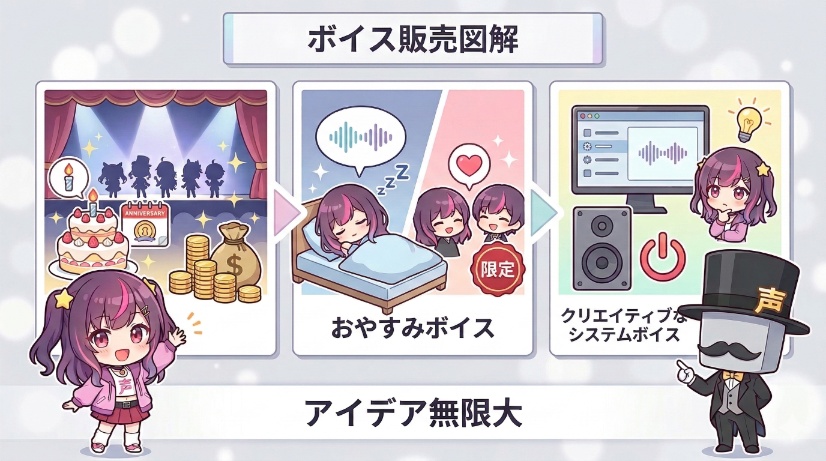 また、個人で活動するVTuberも、ファンへの感謝を込めた「おやすみボイス」や、活動記念の「限定セリフボイス」などを販売し、ファンとの絆を深めるきっかけにしているんですよね。