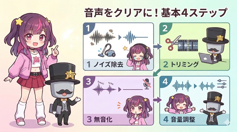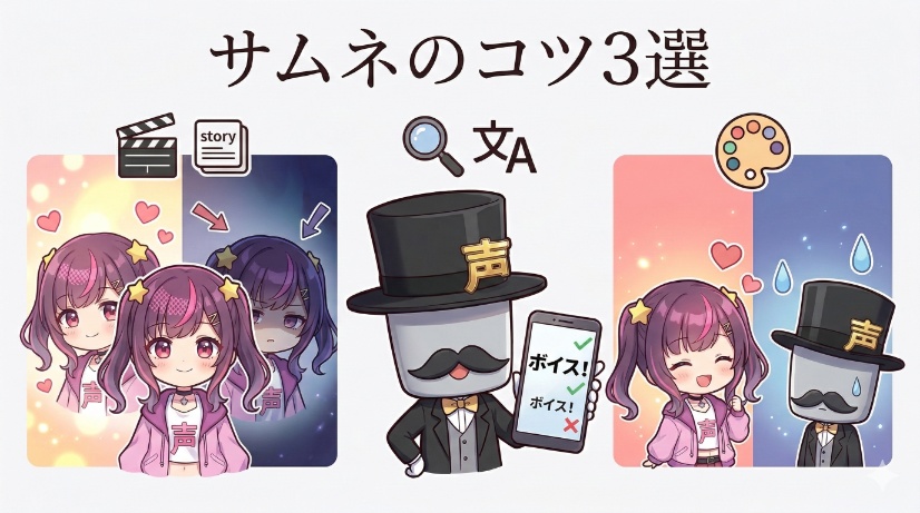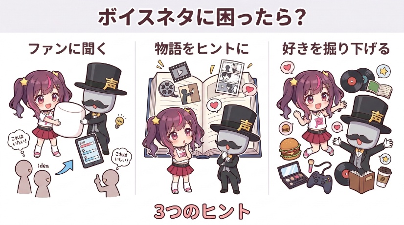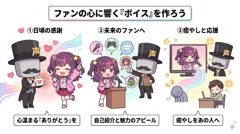 知識ゼロからでも自信を持って、ファンに喜ばれる最高のボイスが作れるように、一つひとつ丁寧に解説していきますので参考にしてみてください。