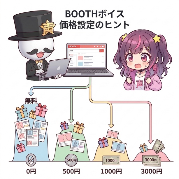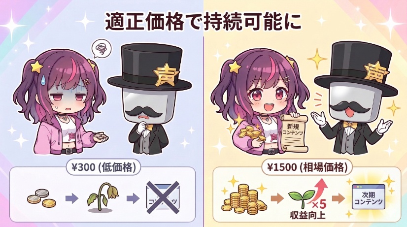 例えば、10分の力作シチュエーションボイスを300円で販売してしまうと、購入したファンは満足するかもしれませんが、作者の労力に見合わず、次への制作意欲が削がれてしまう可能性があります。