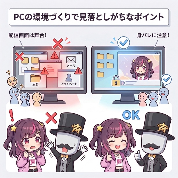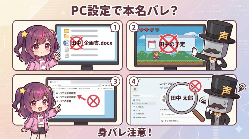 ここでは、多くの新人Vtuberが見落としがちな、身バレに繋がる以下2点のNG行動を解説します。