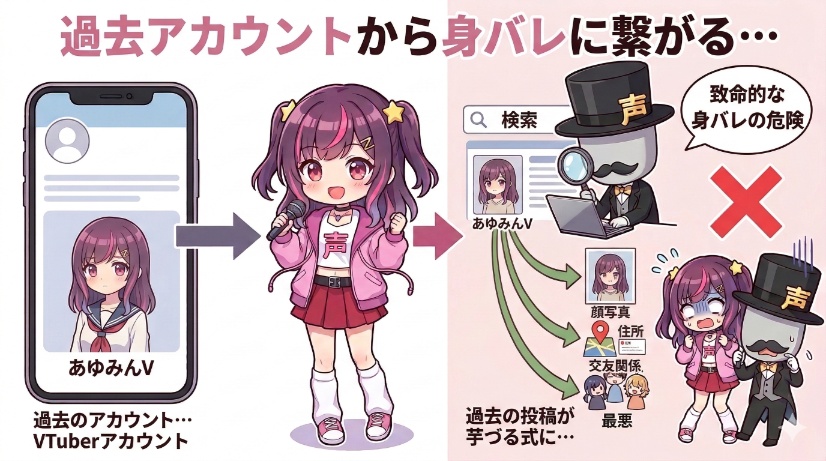 Vtuber生命を脅かす「身バレ」の最大の原因となるため、活動用SNSアカウントとプライベートアカウントの連携・併用は、絶対にやってはいけません