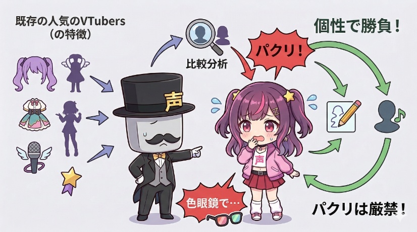 デビューと同時に「パクリVtuber」のレッテルを貼られないために、特定のVtuberと酷似したデザインや設定で活動を始めるのは絶対にやってはいけないNG行動です。