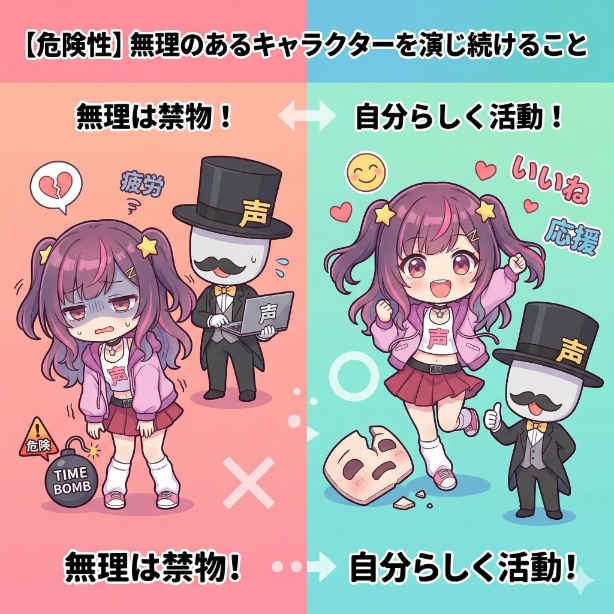 演じ続けるうちに心身が疲弊して活動が苦痛になるだけでなく、ふとした瞬間に「素」が出て設定が崩壊し、ファンからの信頼を失うリスクも抱えています。