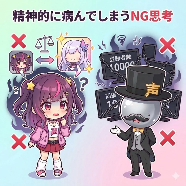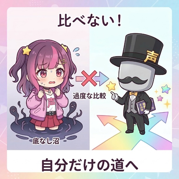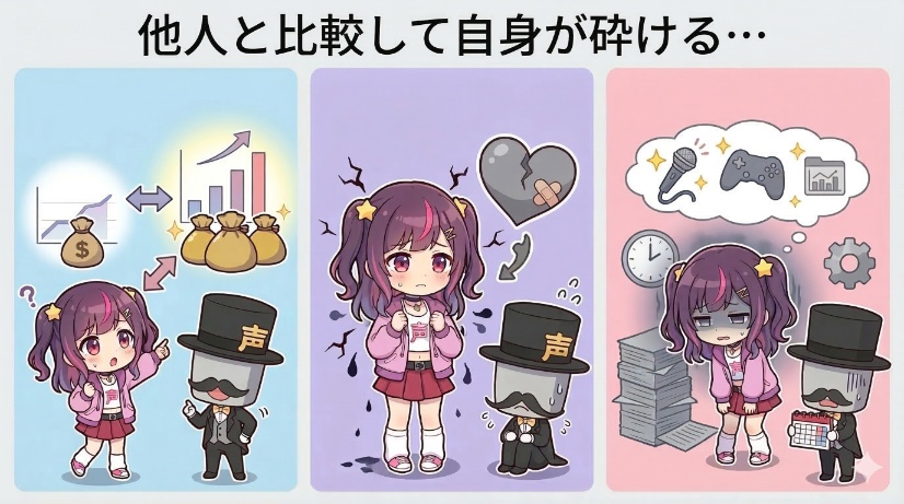 同期や他のVtuberと自分を過度に比較することは、あなたの個性と活動の楽しさを奪い、嫉妬と焦りという「底なし沼」に引きずり込む可能性があるので、絶対にやってはいけません。