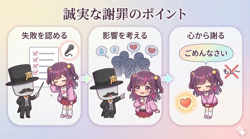 ファンは、あなたがただ後悔しているかだけでなく、今回の失敗から何を学び、どう変わろうとしているのかを見ています。