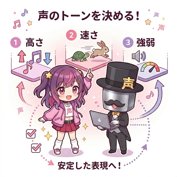 - 声の高さ: 「高貴」さを出すため、標準〜やや低めを意識する。