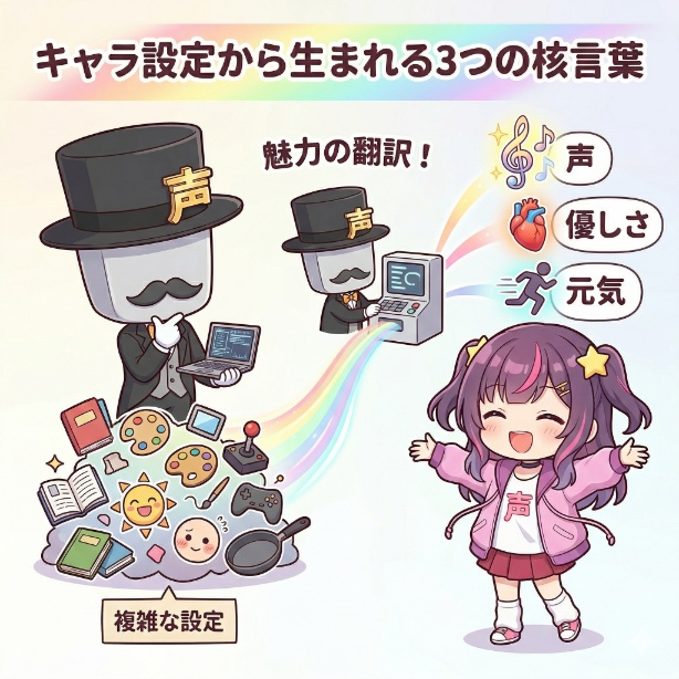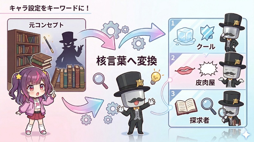 この作業は、新しい設定を作るのではなく、あなたのキャラクターの魅力的なコンセプトを、よりシンプルで使いやすい「キーワード」に変換する、いわば翻訳作業のようなものです。