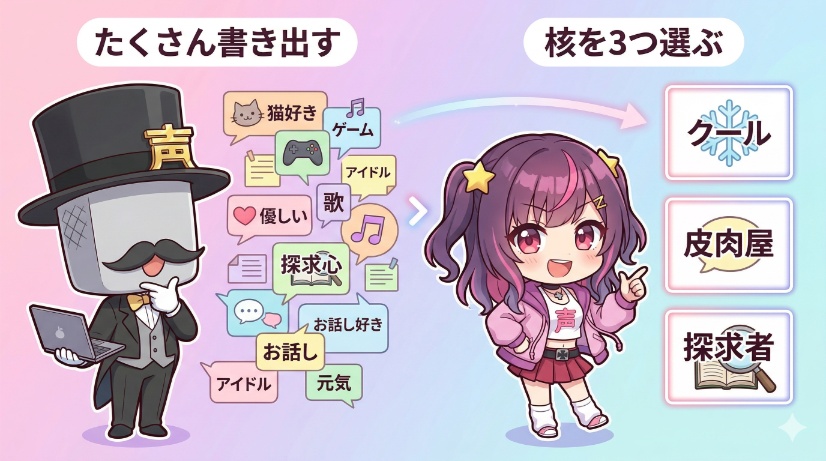 そんな「キャラがブレる」という悩みを解決する最も簡単で強力な方法が、あなたのキャラクターの魂となる「3つの核(コア)言葉」を決めることです。