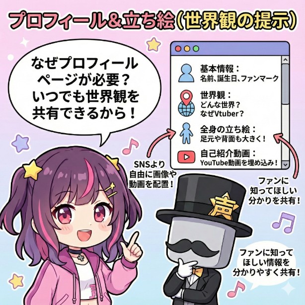 また、垢BAN対策だけではなく、あなた自身のVtuberとしてのキャラ設定や世界観、プロフィールなどの詳細情報をファンや企業に伝えて、ファン満足度や信頼度を向上させる役割もあり、大きな武器となります。