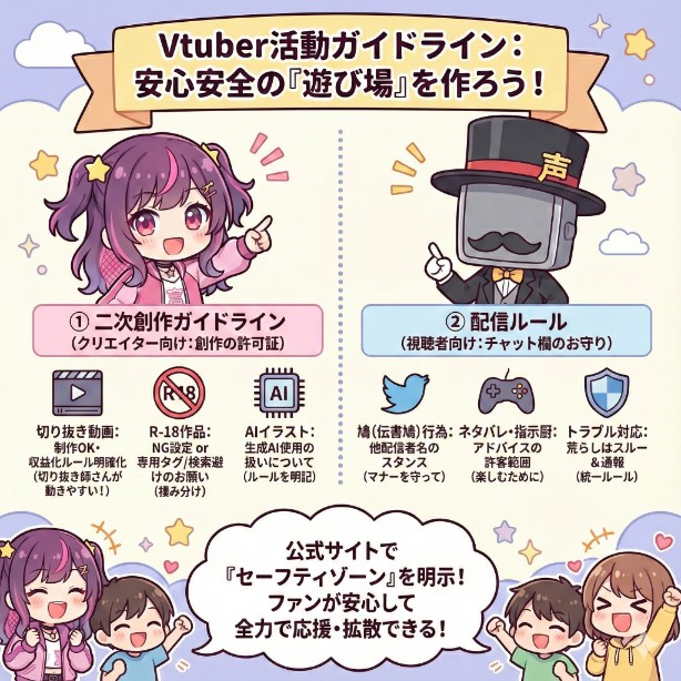 個人勢こそ「二次創作ルール」と「配信ルール」の2つを公式サイトで明確にすべきです。