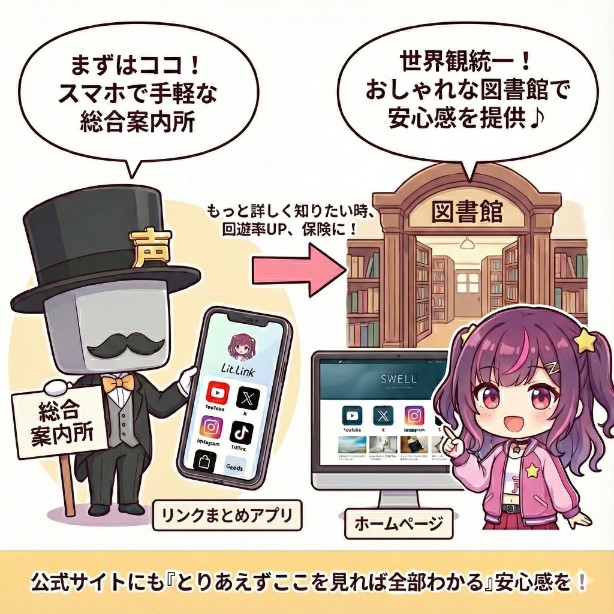 同じ機能を持った、リンクまとめアプリ(リットリンクなど)はそのまま利用して問題ありません。しかし、公式サイト内にも同じような「案内ページ」を作ることを強くおすすめします。