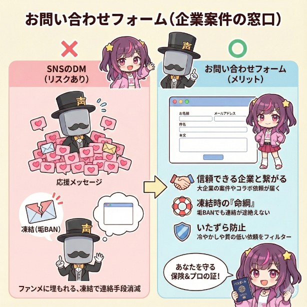 なぜなら、SNSのDMは手軽で便利ですが、ファンからの応援メッセージに重要な連絡が埋もれてしまったり、アカウント凍結(垢BAN)で連絡手段が消滅したりするリスクがあるからです。