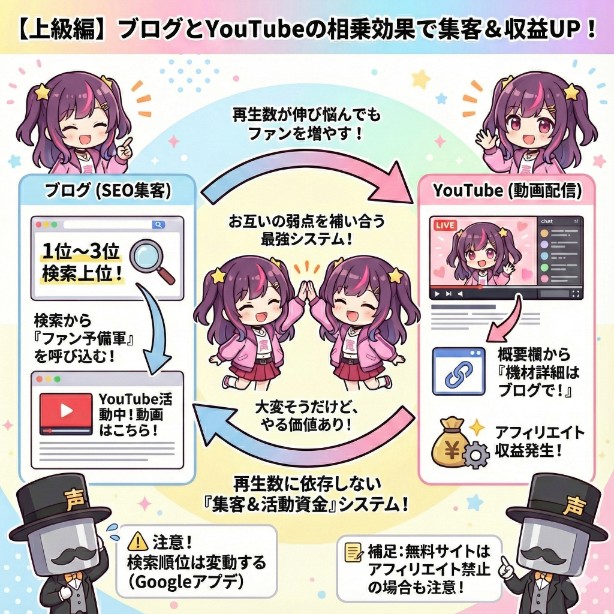 ブログとYouTubeを両方やることで、「お互いの弱点を補い合う集客・収益システム」を作ることができます。