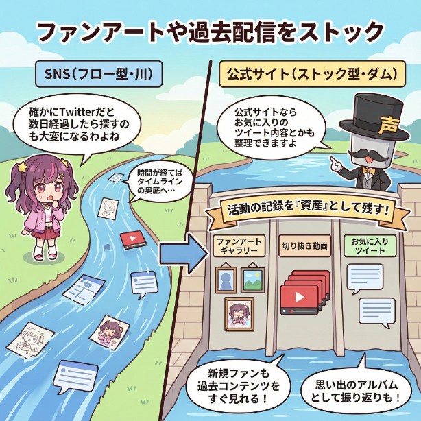 これでは、ファンが時間をかけて描いてくれた大切なイラストや、奇跡的に面白かった切り抜き動画も、一瞬の盛り上がりだけで消費されて終わってしまいます。