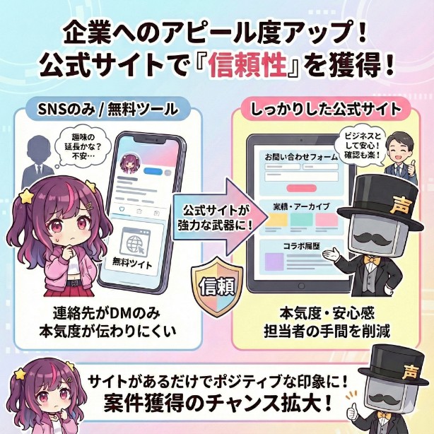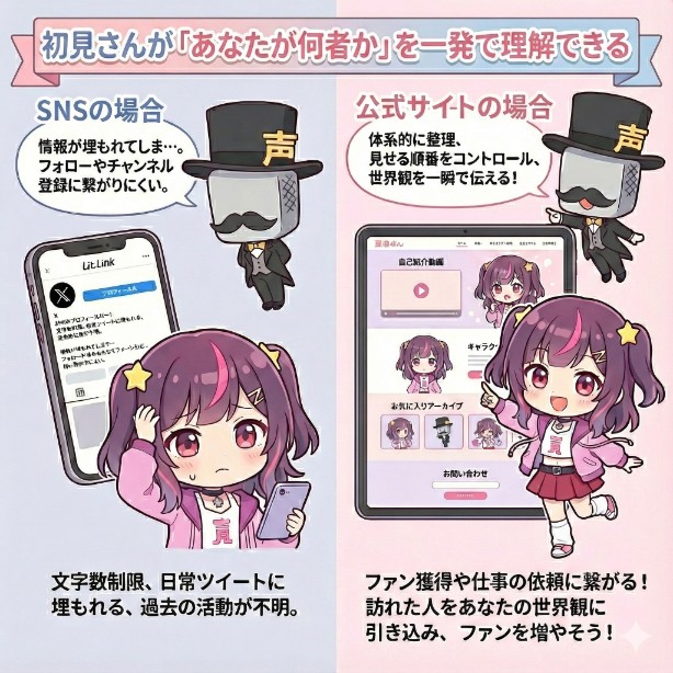 公式サイトを持つことで、初見のリスナーに対して「あなたがどんなVTuberなのか」を瞬時に伝え、ファンになってもらえる確率がグッと上がります。