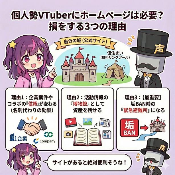 ここでは、なぜ個人勢VTuberにホームページが必要なのか、その決定的な「3つの理由」について解説します。