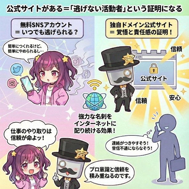 独自ドメインの公式サイトを持つことは、「私はこの活動から簡単には逃げません」という無言のアピールになります。