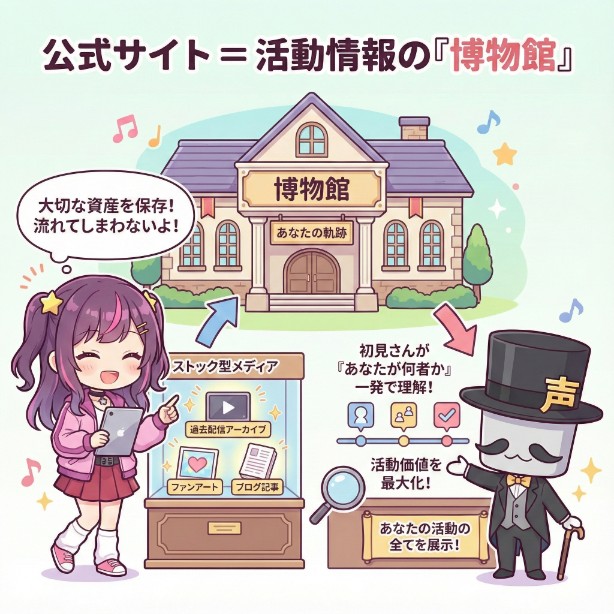 公式サイトは、あなたのこれまでの活動の軌跡を大切に保存し、展示するための「博物館」のような場所です。