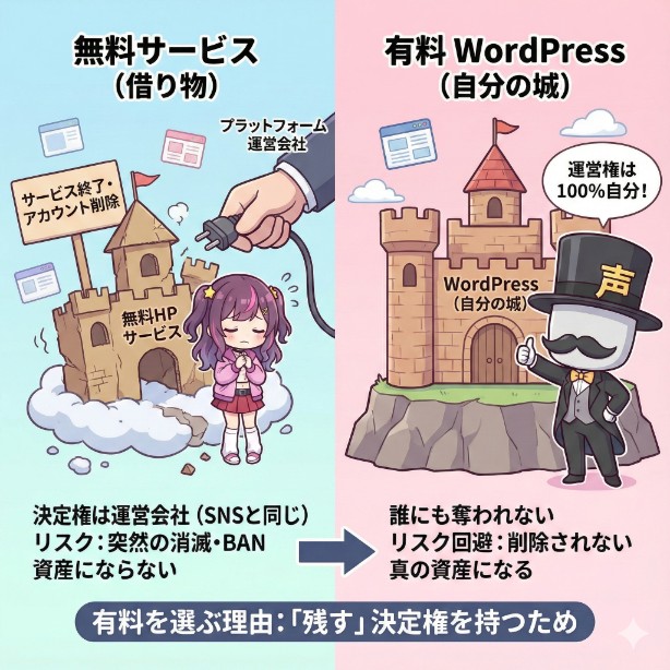 なぜなら、あくまで「仮住まい」に過ぎない無料ツールでは、企業からの信用が得にくく、プラットフォーム依存によるリスク(凍結など)を回避できないからです。