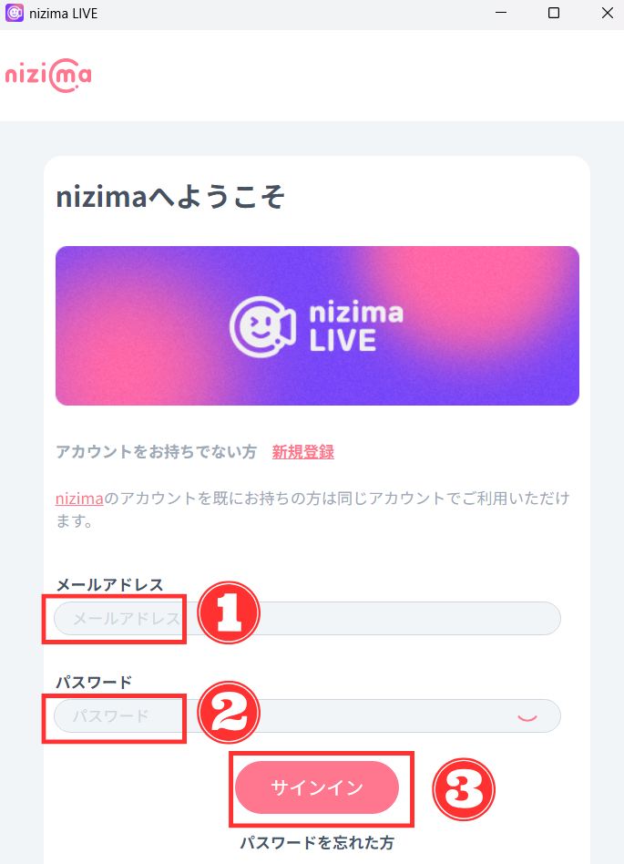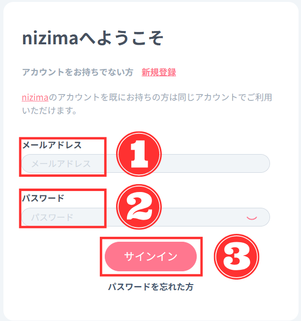サインイン画面が表示されたら、「①メールアドレス」と「②パスワード」入力後、「③サインイン」をクリック。↓